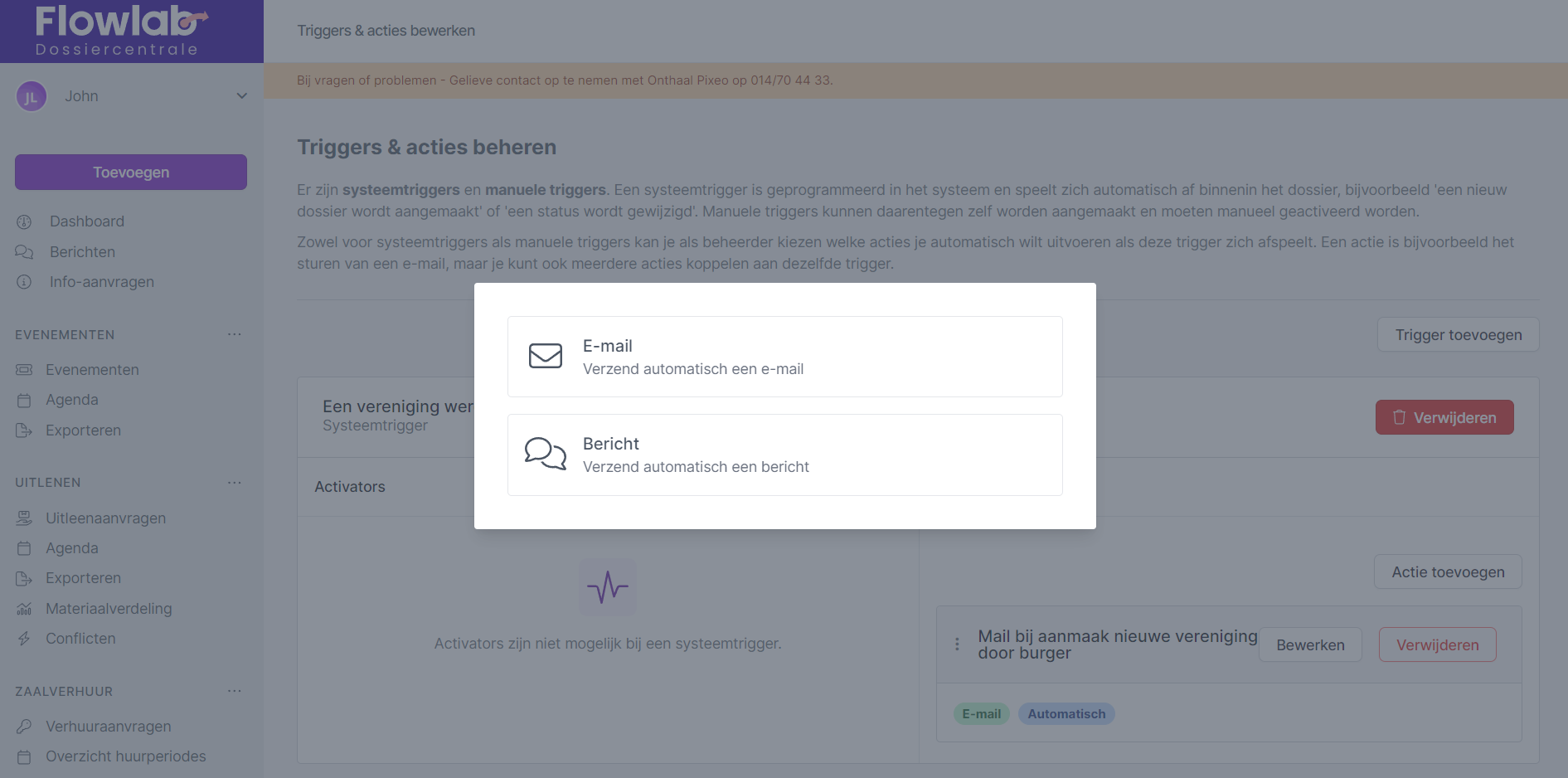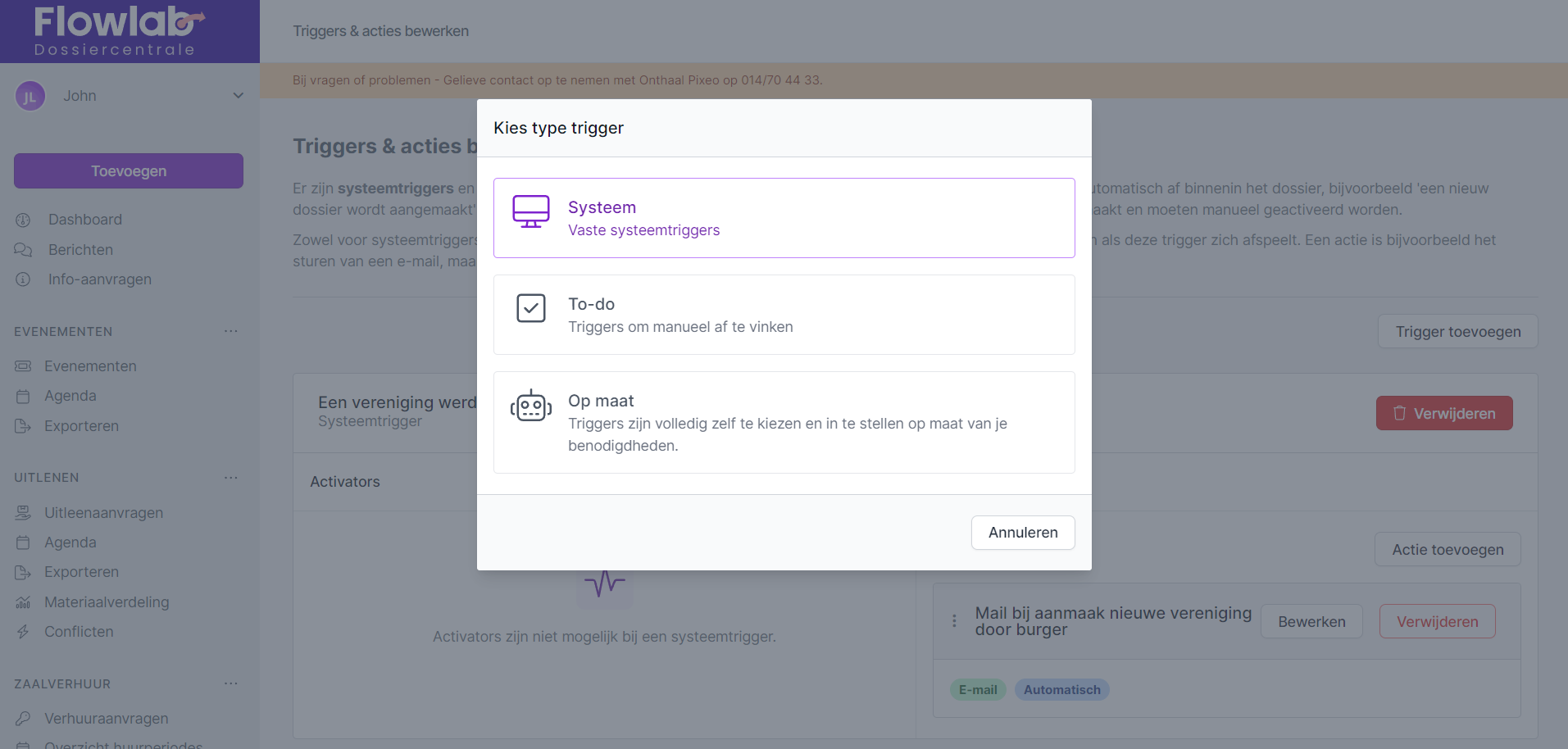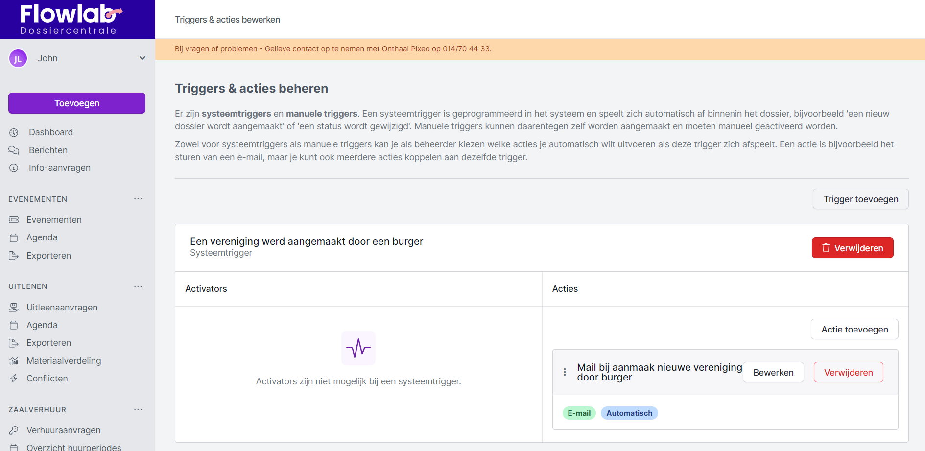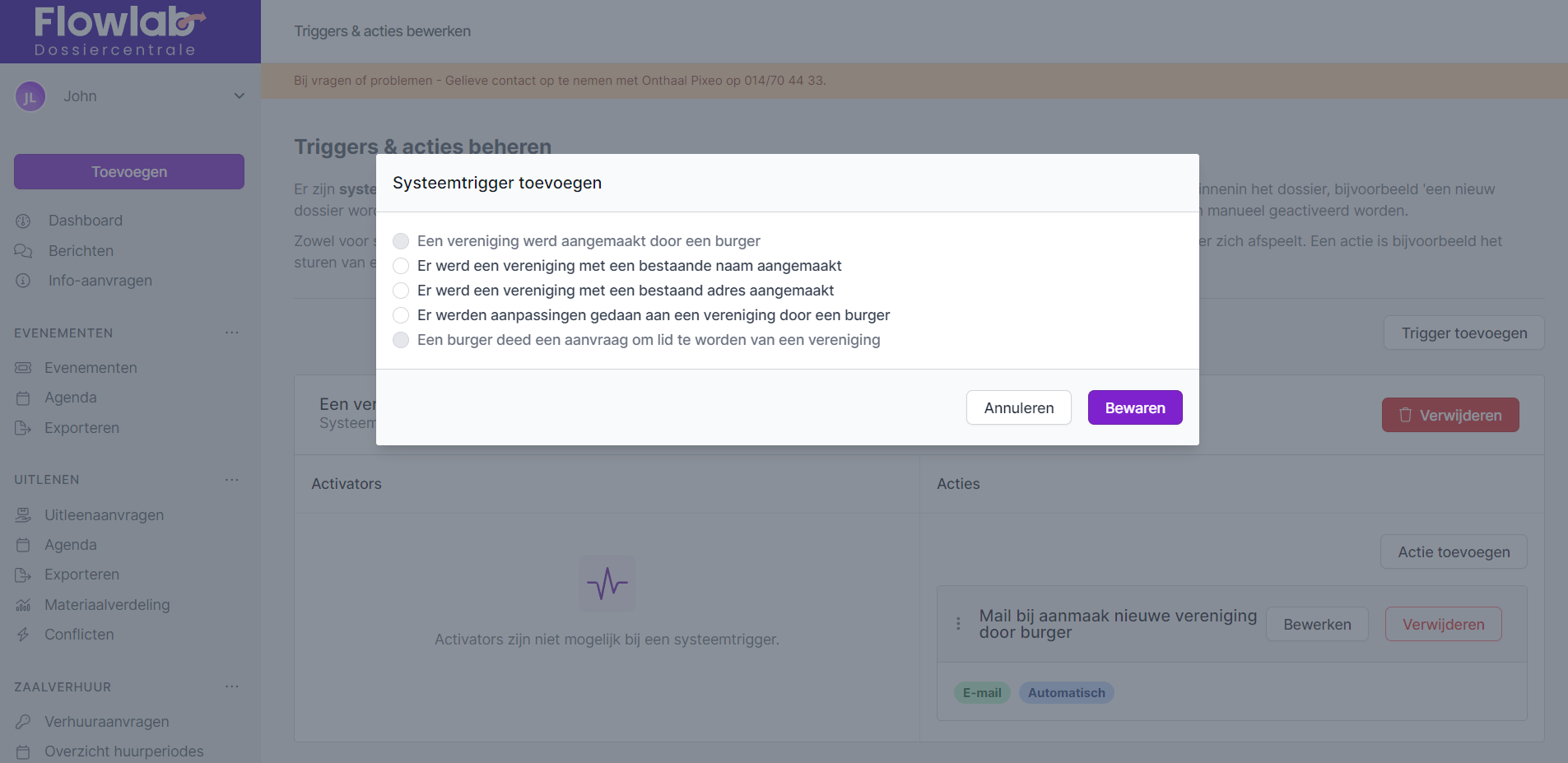 Op deze manier bepaal je welke acties er automatisch of manueel dienen te gebeuren wanneer bijvoorbeeld een burger een aanvraag doet om lid te worden van een vereniging of wanneer een burger een vereniging aanmaakt. Een actie kan bijvoorbeeld zijn het versturen van een mail naar een bepaalde medewerker om de vraag op te volgen.