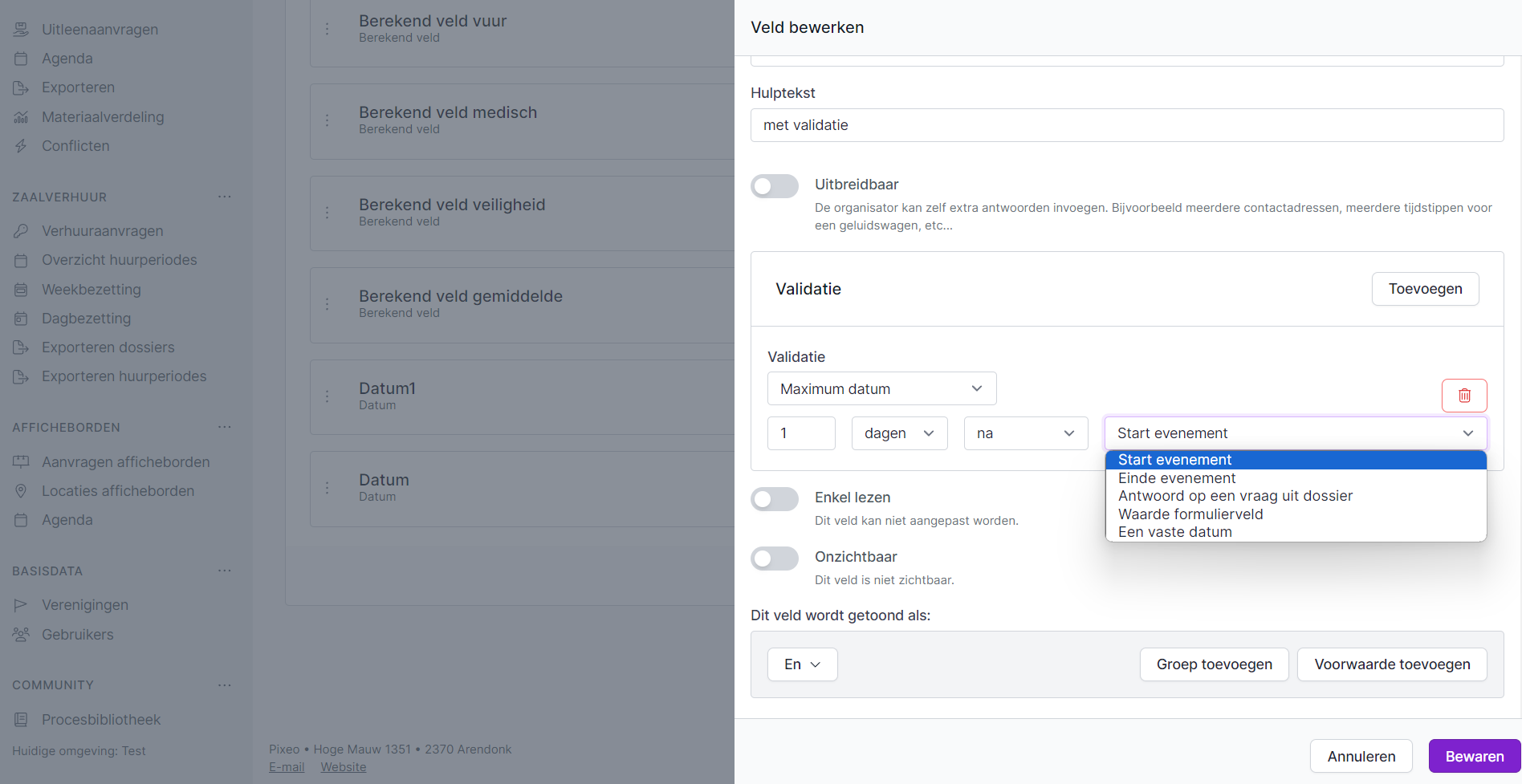 Bij het veldtype Datum kan je een validatie toevoegen die de datumselectie beperkt tot een bepaalde periode, voor en/na een bepaald tijdstip.