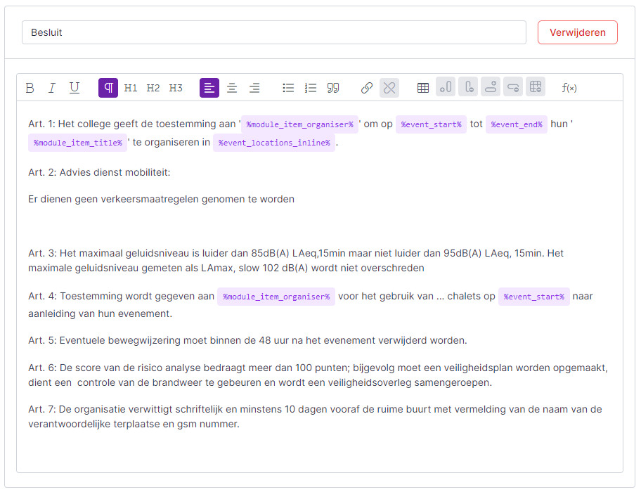 - In het tekstveld per item verwoord je de tekst zoals dit in jullie besluiten gebruikelijk is. Je kan gebruik maken van de dynamische velden om specifieke data uit het Flowlabdossier mee over te nemen. Gebruik hier geen dynamische velden die een lijst of specifieke opsomming bevatten. Deze velden zijn eerder bedoeld om een opsomming te geven in een rapport enz. Hier in de link met Meeting.net gebruik je de ‘enkelvoudige’ data: namen, start- en einddatum, titel van het dossier, etc. Tip: Voor de locatie gebruik je het dynamische veld %event_locations_inline% om het adres van de locatie mooi in de Meeting.net word file te tonen.