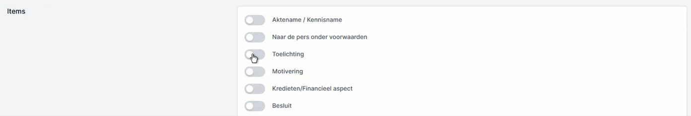 - Zo voeg je de overige items ook toe. In ons voorbeeld van hierboven gaat het dan nog over ‘Kredieten/financieel aspect’, ‘Motivering’, ‘Besluit’ en ‘Samenvatting’. Let hier telkens op de correcte schrijfwijze, neem de exacte bewoording uit Meeting.net over bij de titel van het nieuw toe te voegen item in Flowlab.