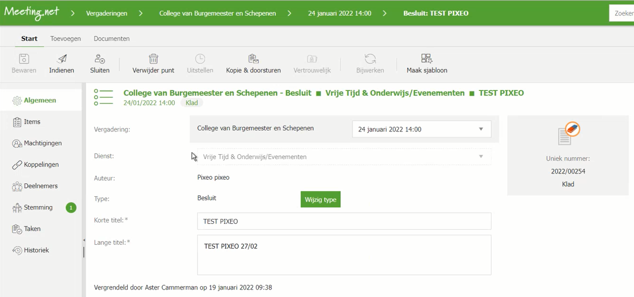 Wanneer er een integratie met Meeting.net actief is, kan je een dossier met enkele klikken exporteren naar Meeting.net. Je kiest het type vergadering (bv "College burgemeester en schepenen") en krijgt dan de verschillende data waarop deze vergaderingen gepland zijn. Je kiest een datum en geeft jouw agendapunt een naam. Bij evenementen is deze naam standaard ingevuld met de naam van het evenement, maar ook dit is aanpasbaar.