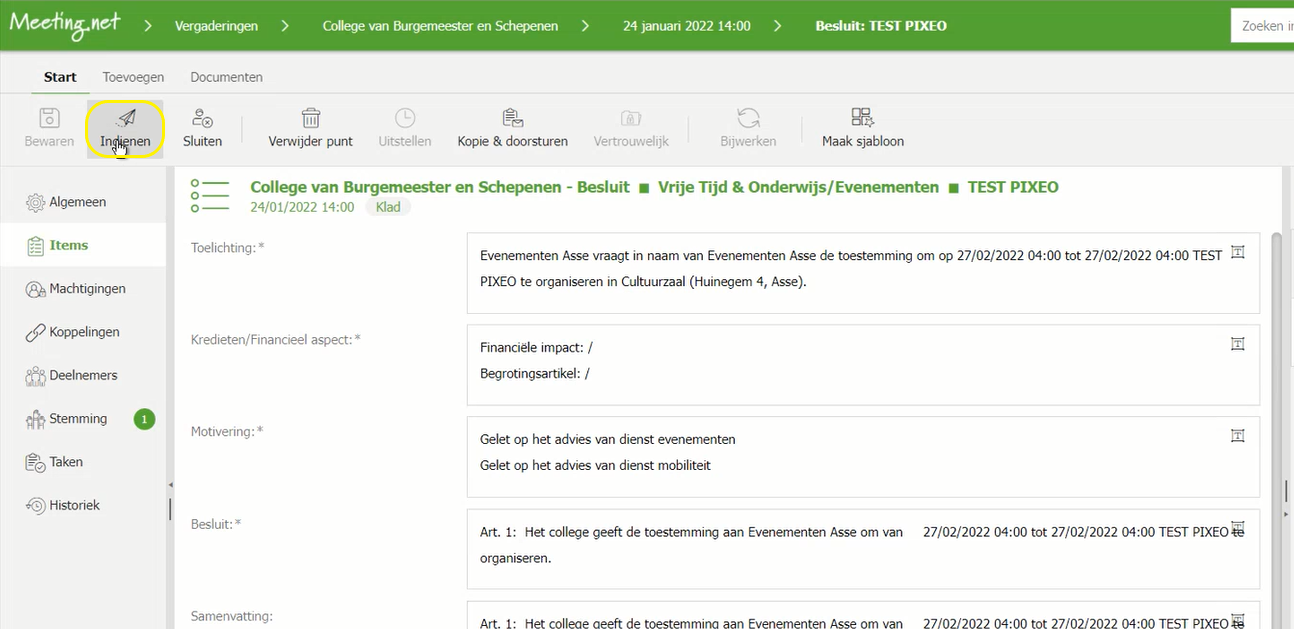 - Per punt (Besluiten Burgemeester, Gemeenteraad, of dus hier College van Burgemeester en Schepenen) kan je items toevoegen die je mee wil exporteren naar Meeting.net.