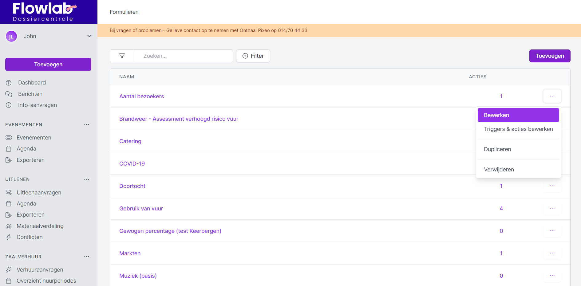 Om formulieren bij evenementen te bewerken of te verwijderen, volg je onderstaande stappen. Hou hierbij wel steeds de dossierflow van de evenementsaanvraag in het achterhoofd.