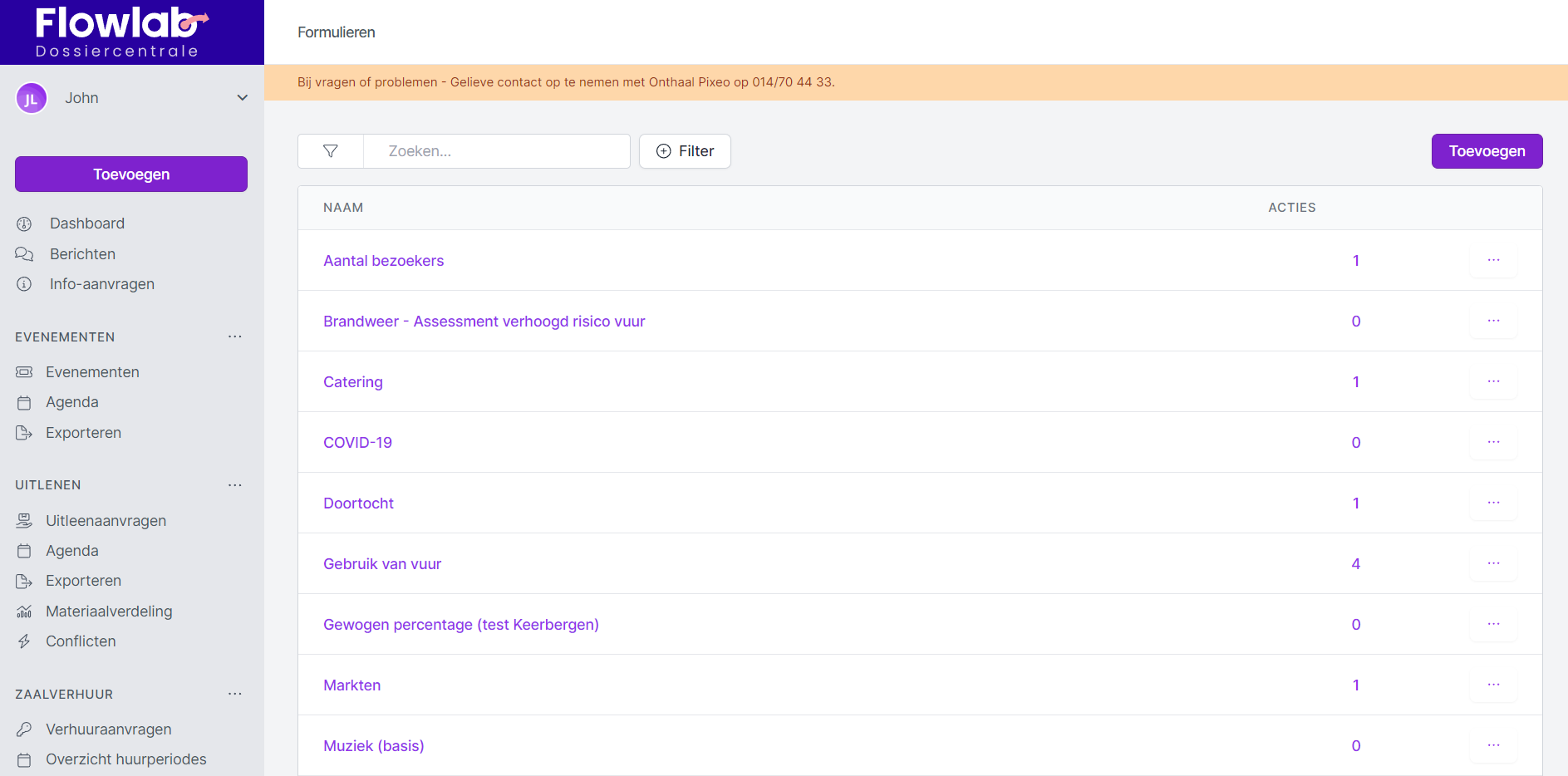 Je kan makkelijk een formulier bij evenementen zoeken in het overzicht door gebruik te maken van de zoekfunctie of de filterknoppen.