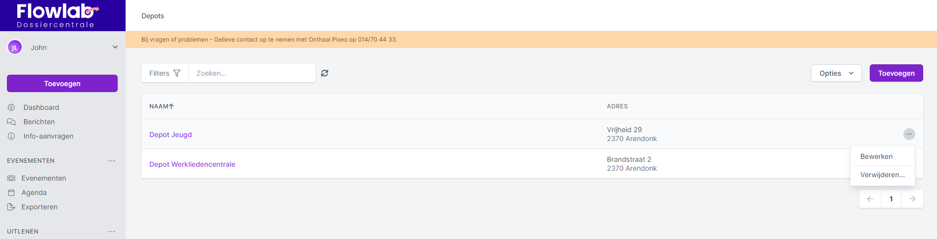 Op de pagina Depots onder de module Uitlenen staat een overzicht van de ingegeven depots. Vanaf deze pagina kan je de informatie over de verschillende depots bewerken en kan je depots verwijderen.