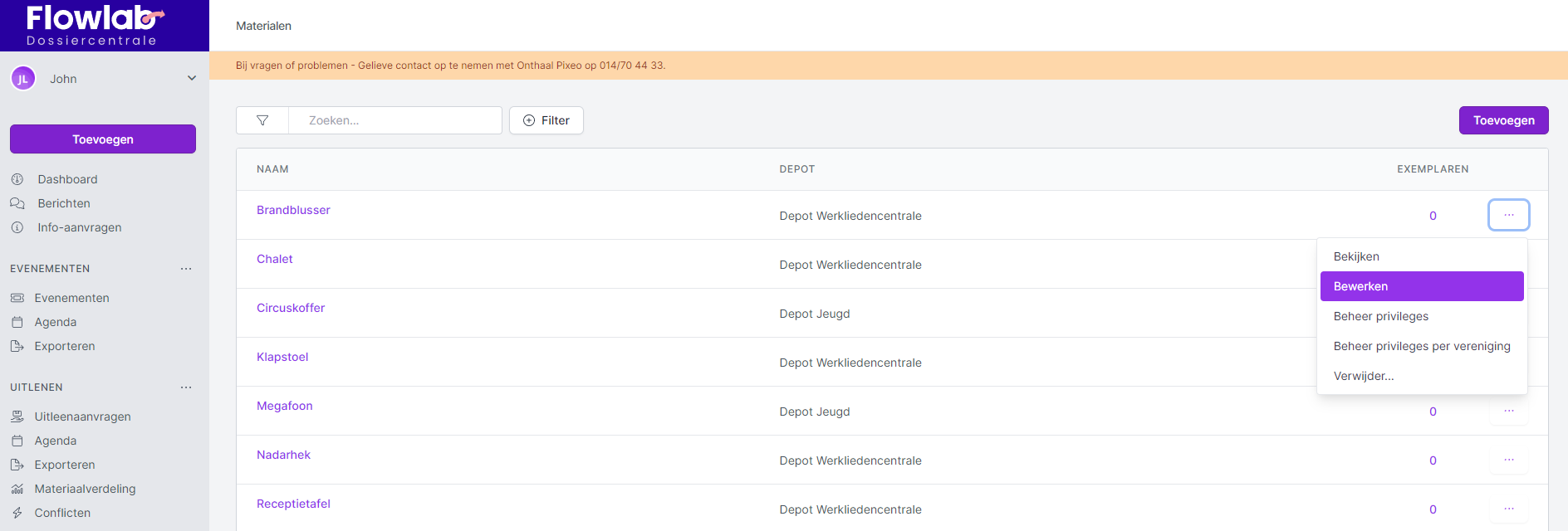 Op de pagina Materialen onder de module Uitlenen staat een overzicht van het ingegeven materiaal. Vanaf deze pagina kan je de informatie van de verschillende materialen bewerken en kan je materialen verwijderen.