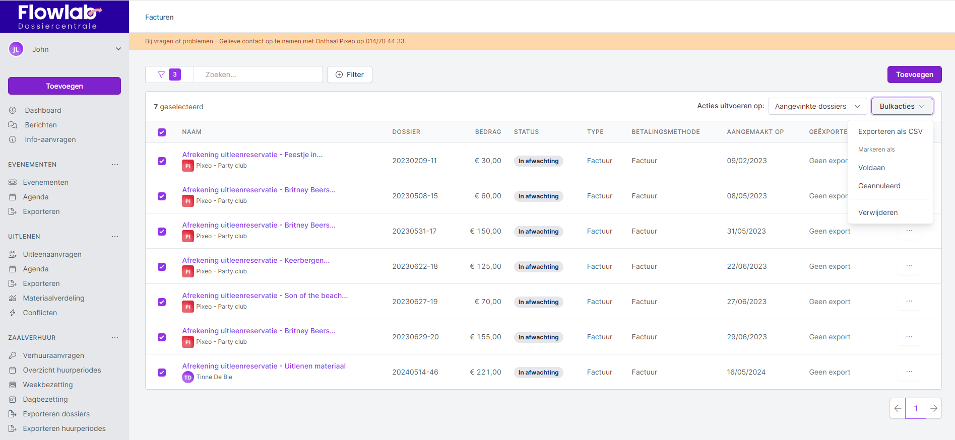 Via de pagina Facturen onder de module Uitlenen krijg je een overzicht van alle aangemaakte facturen voor de uitleenaanvragen. Via deze pagina kan je de facturen bekijken, verwerken, eventueel verwijderen en exporteren.