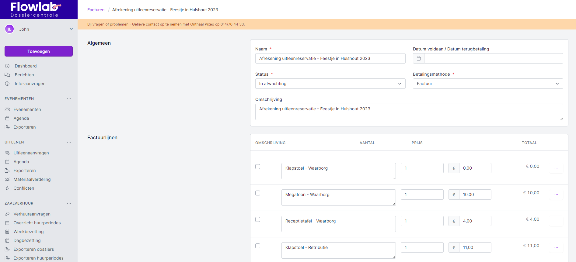 Hoe pas ik de factuur aan via de pagina Facturen bij de uitleenmodule?