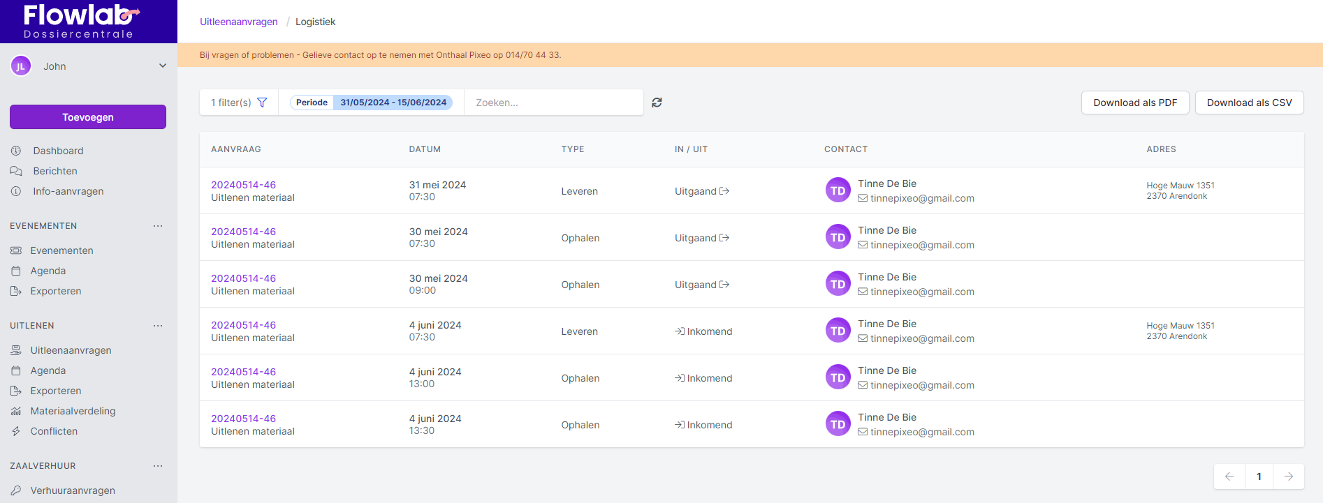 Op de pagina Logistiek onder de module Uitlenen kan je via de filter bovenaan links aanduiden voor welke periode je de logistiek wil opvolgen en voor welke type, al dan niet in combinatie met inkomend/uitgaand.