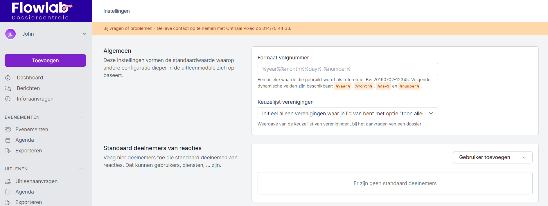 - Formaat volgnummer: Elke uitleenaanvraag krijgt een volgnummer. Hier kan je het formaat van het volgnummer instellen door middel van dynamische velden: