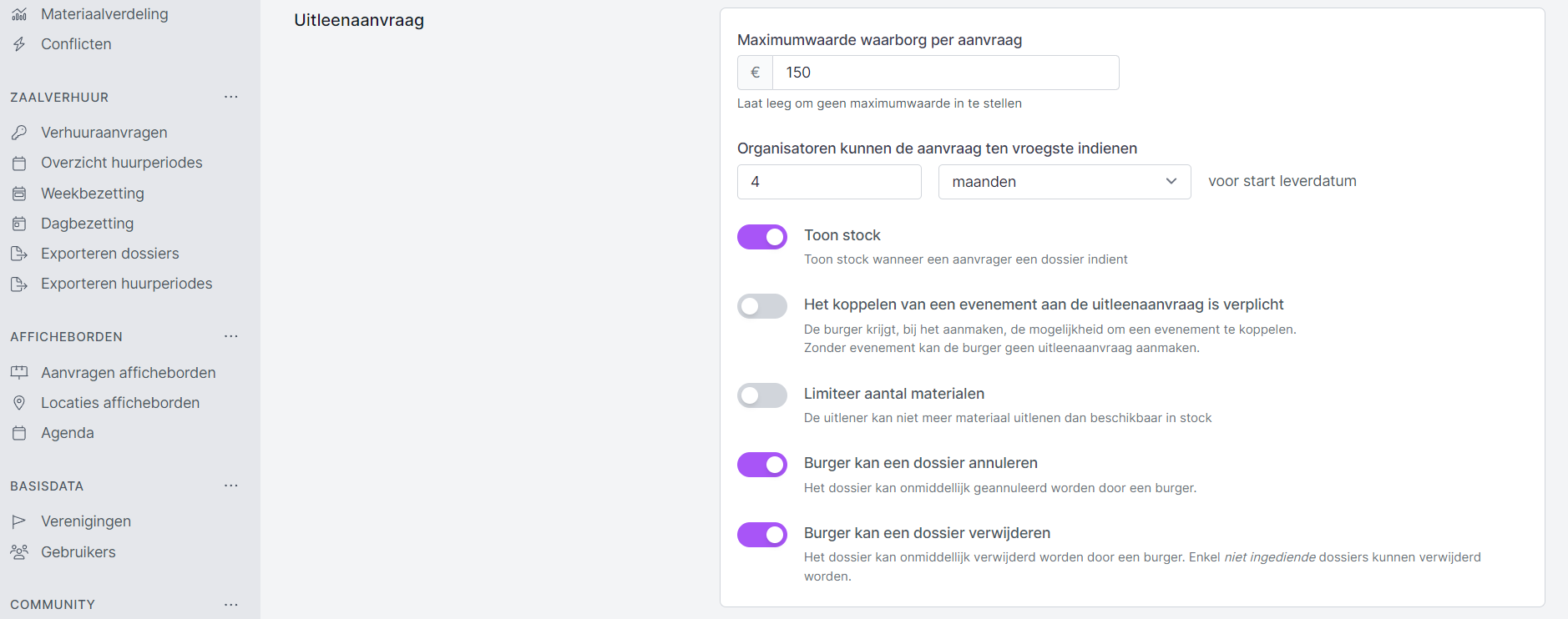 - Organisatoren kunnen de aanvraag ten vroegste indienen: hier bepaal je voor alle uitleenaanvragen hoe lang op voorhand een aanvraag gemaakt kan worden.