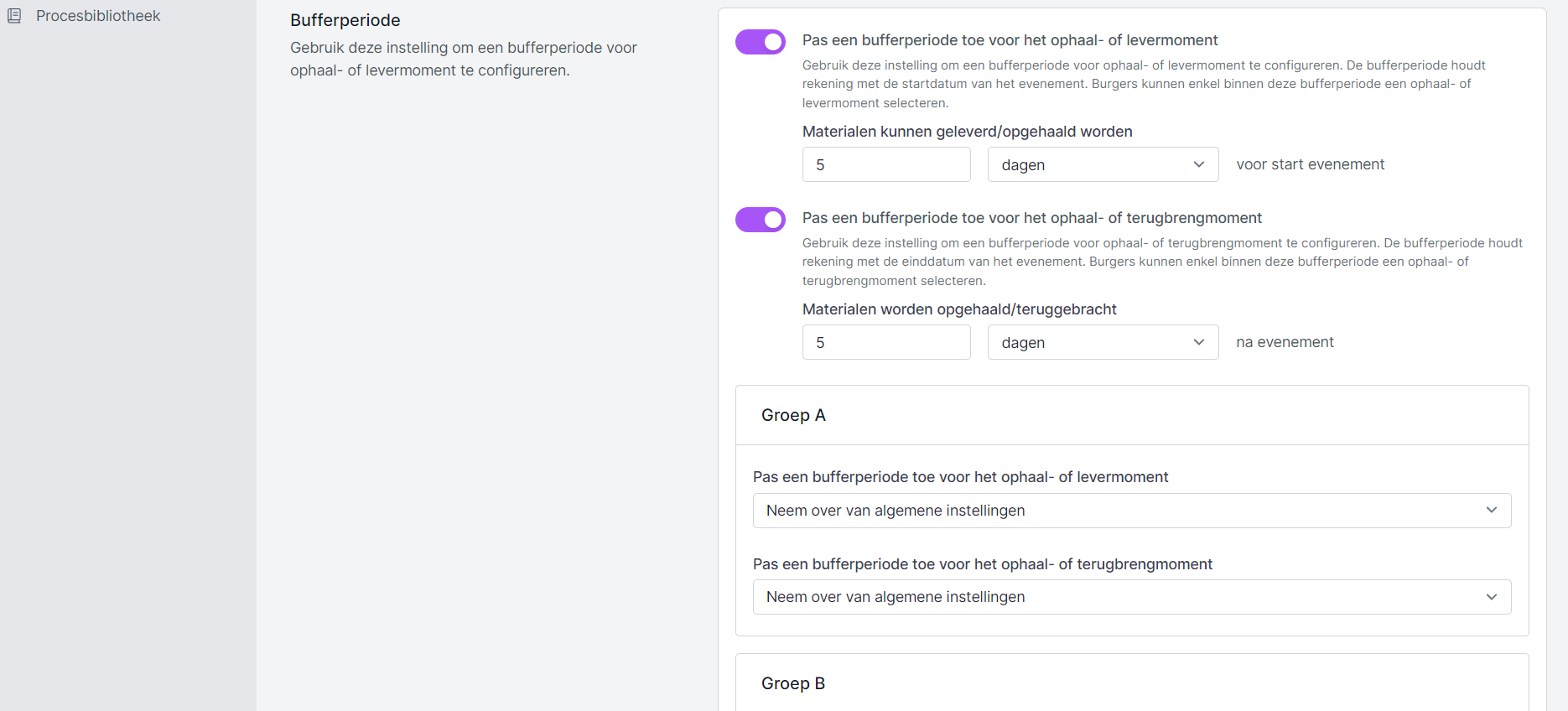 - Pas een bufferperiode toe voor het ophaal- of terugbrengmoment: hier bepaal je binnen de hoeveel tijd materiaal terug gebracht moet worden naar het depot (of wanneer het materiaal door de dienst terug opgehaald wordt bij de aanvrager).