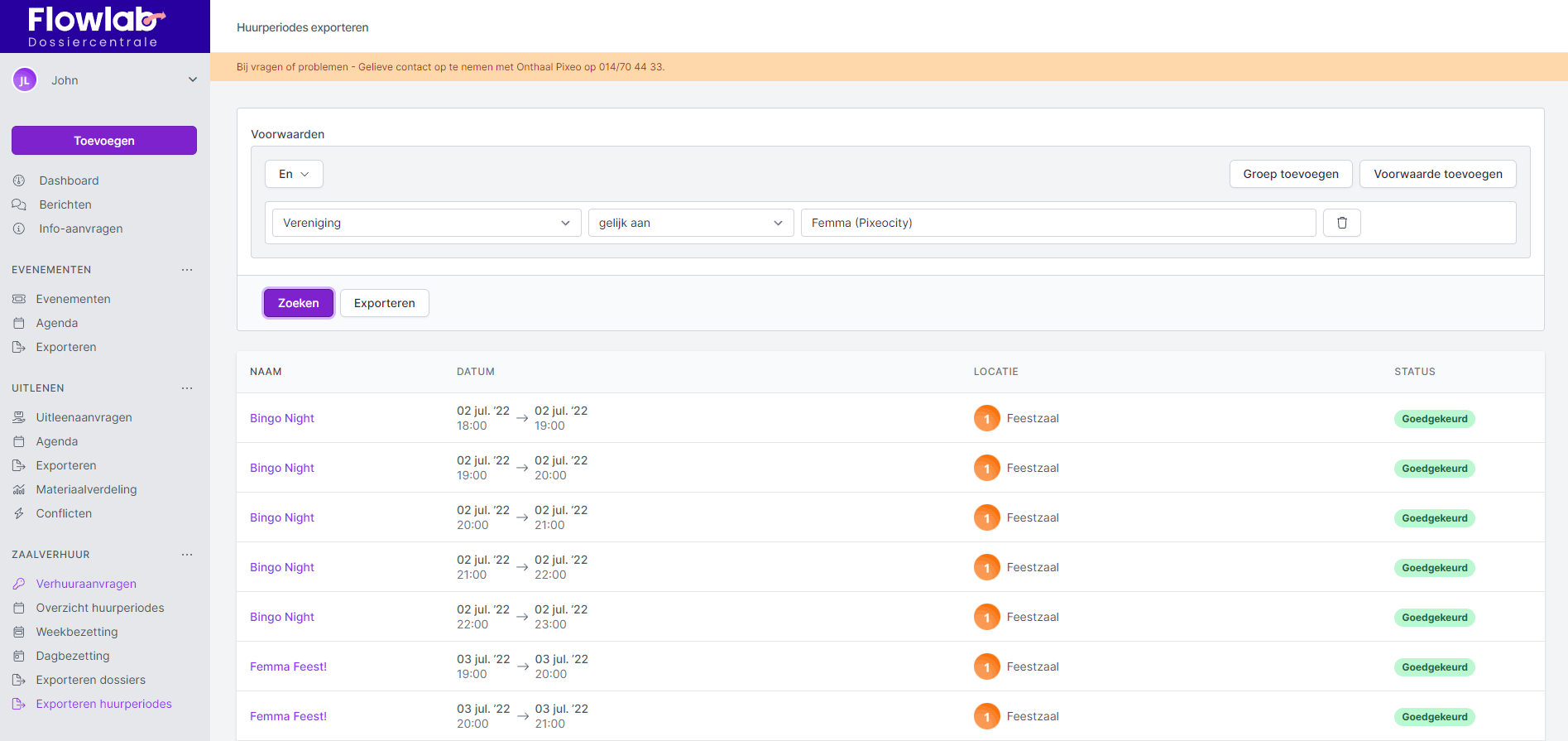 Via Exporteren huurperiodes bij de module Zaalverhuur kan je een lijst van aangevraagde huurperiodes of tijdsloten trekken die aan bepaalde voorwaarden voldoet. Deze lijst kan je gewoon zoeken en raadplegen en/of exporteren.