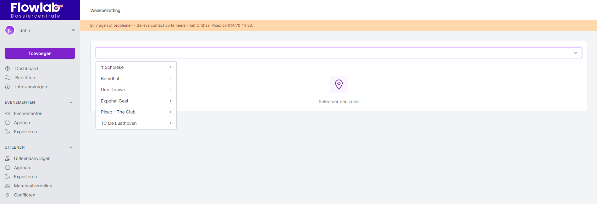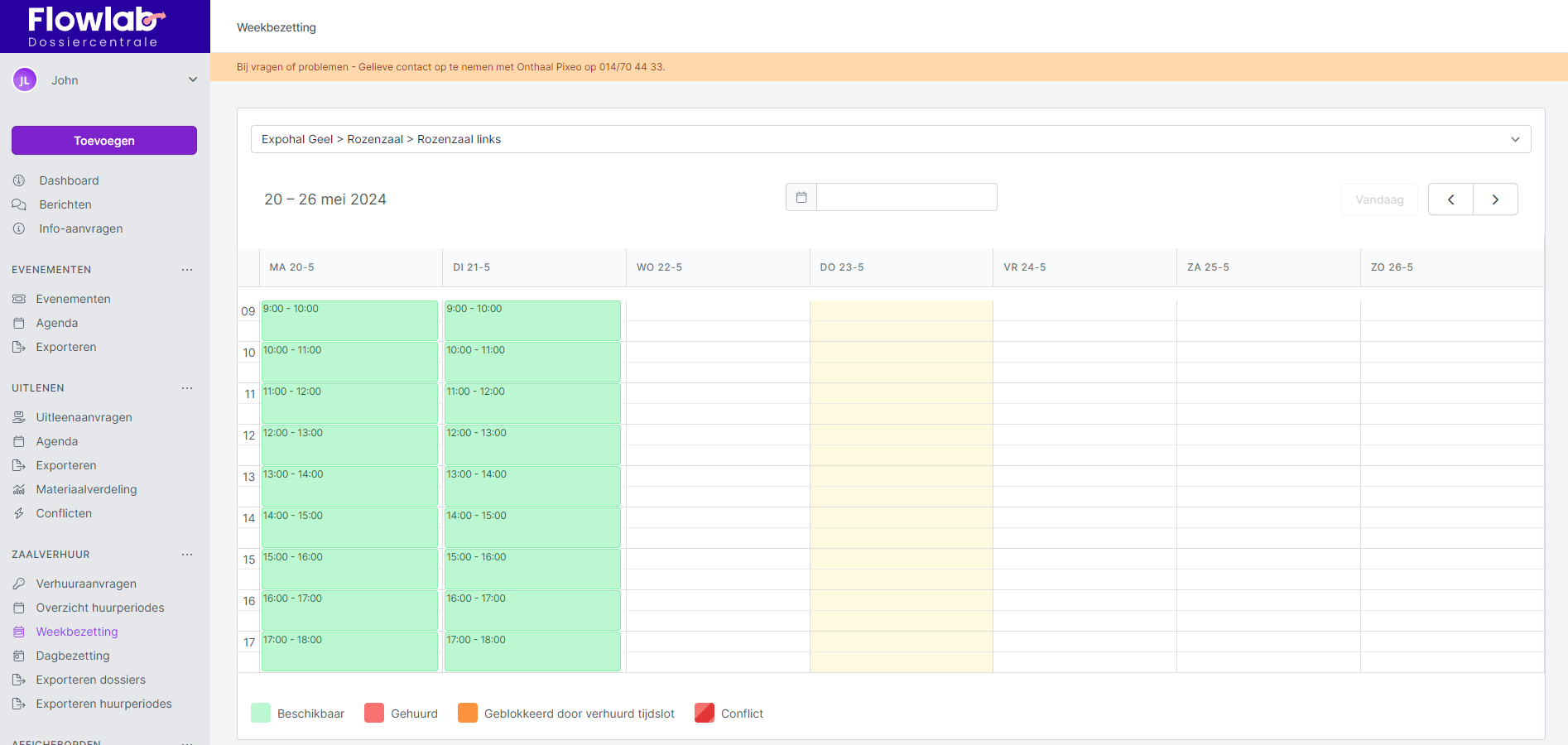 Via de pagina Weekbezetting onder de module Zaalverhuur kan je per locatie een overzicht per week opvragen om de bezetting van de locatie per ruimte/zone te bekijken.