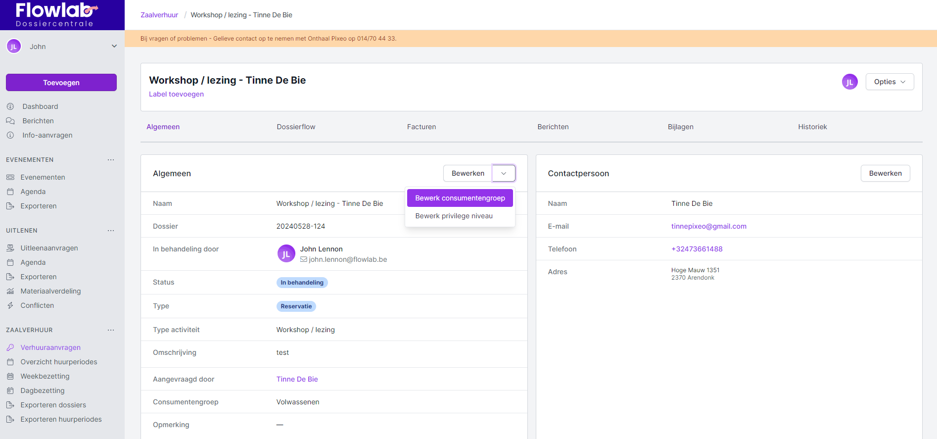 Bij een ingediende aanvraag voor zaalverhuur kan je de consumentengroep en het privilegeniveau wijzigen binnen het dossier.
