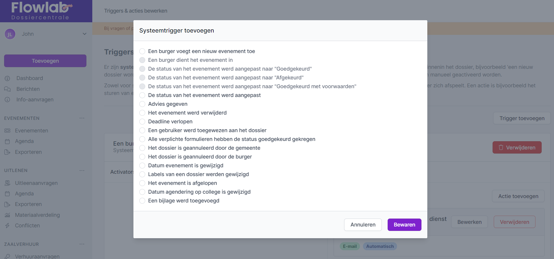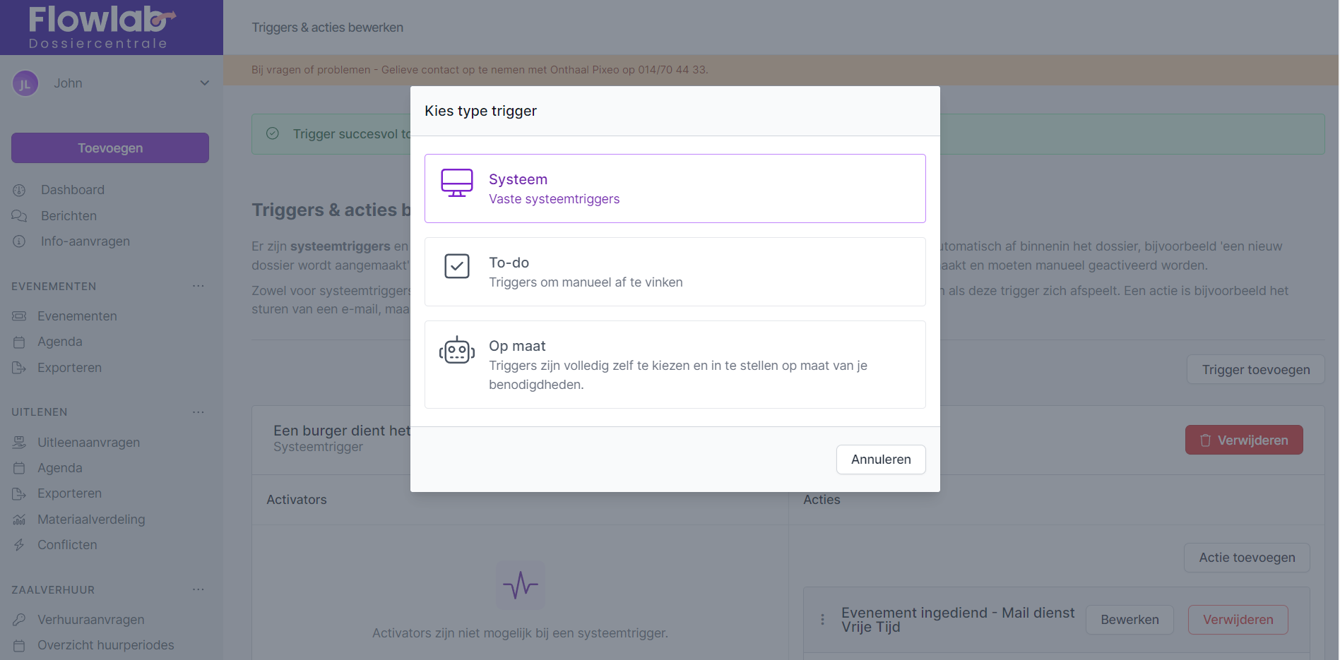 Voor alle soorten triggers kan je als beheerder zelf bepalen welke acties je hieraan wil koppelen en of je deze acties automatisch of manueel wil uitvoeren.