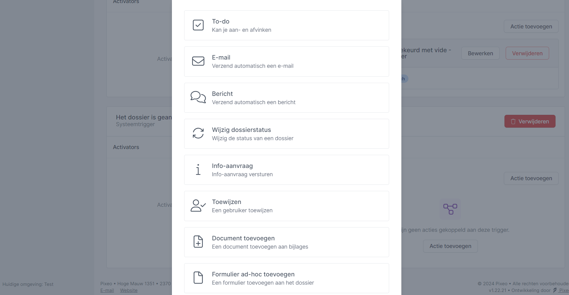 - Document toevoegen: via deze actie kan je automatisch een document laten toevoegen onder het tabblad Bijlagen van het desbetreffende dossier.